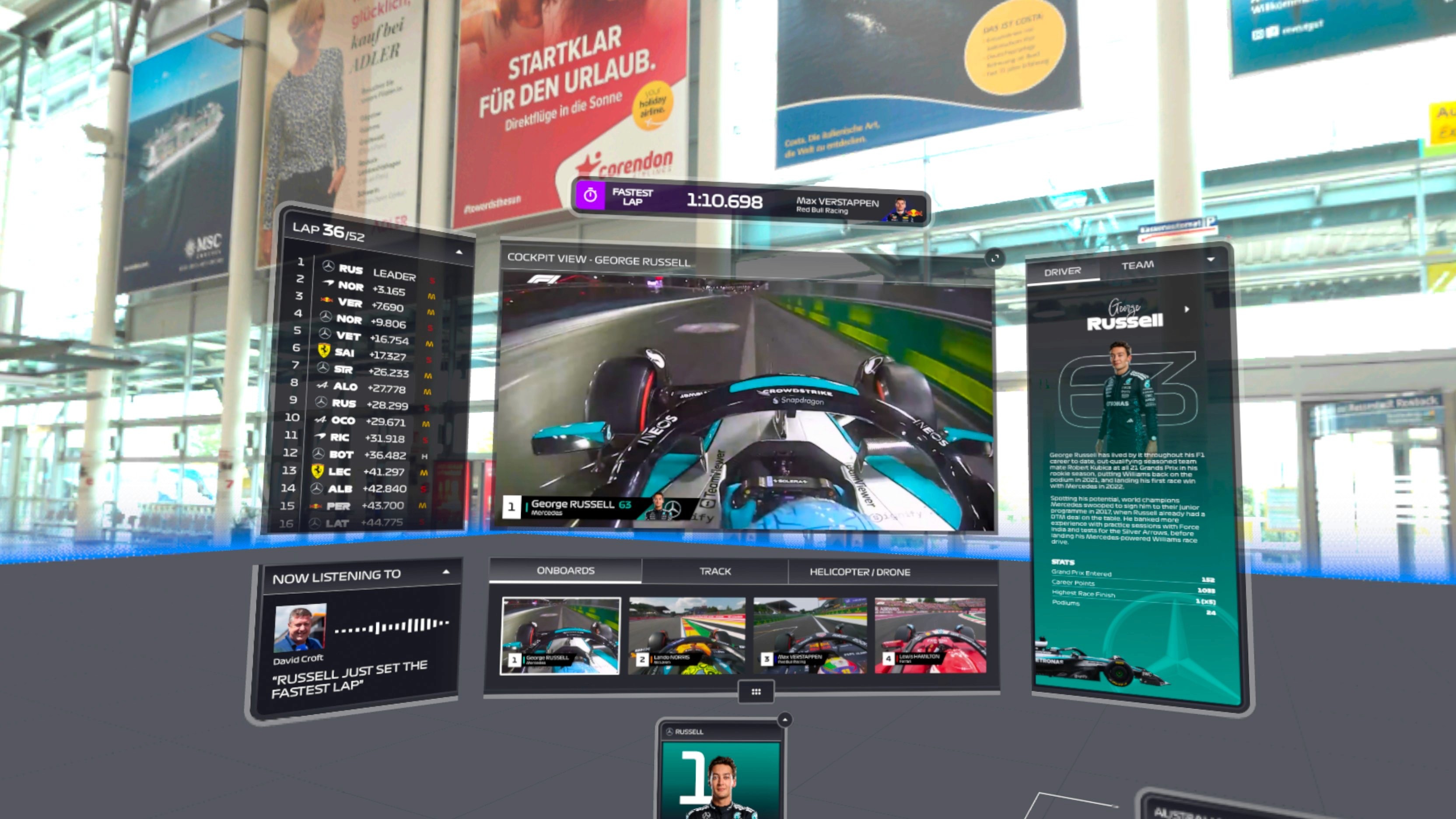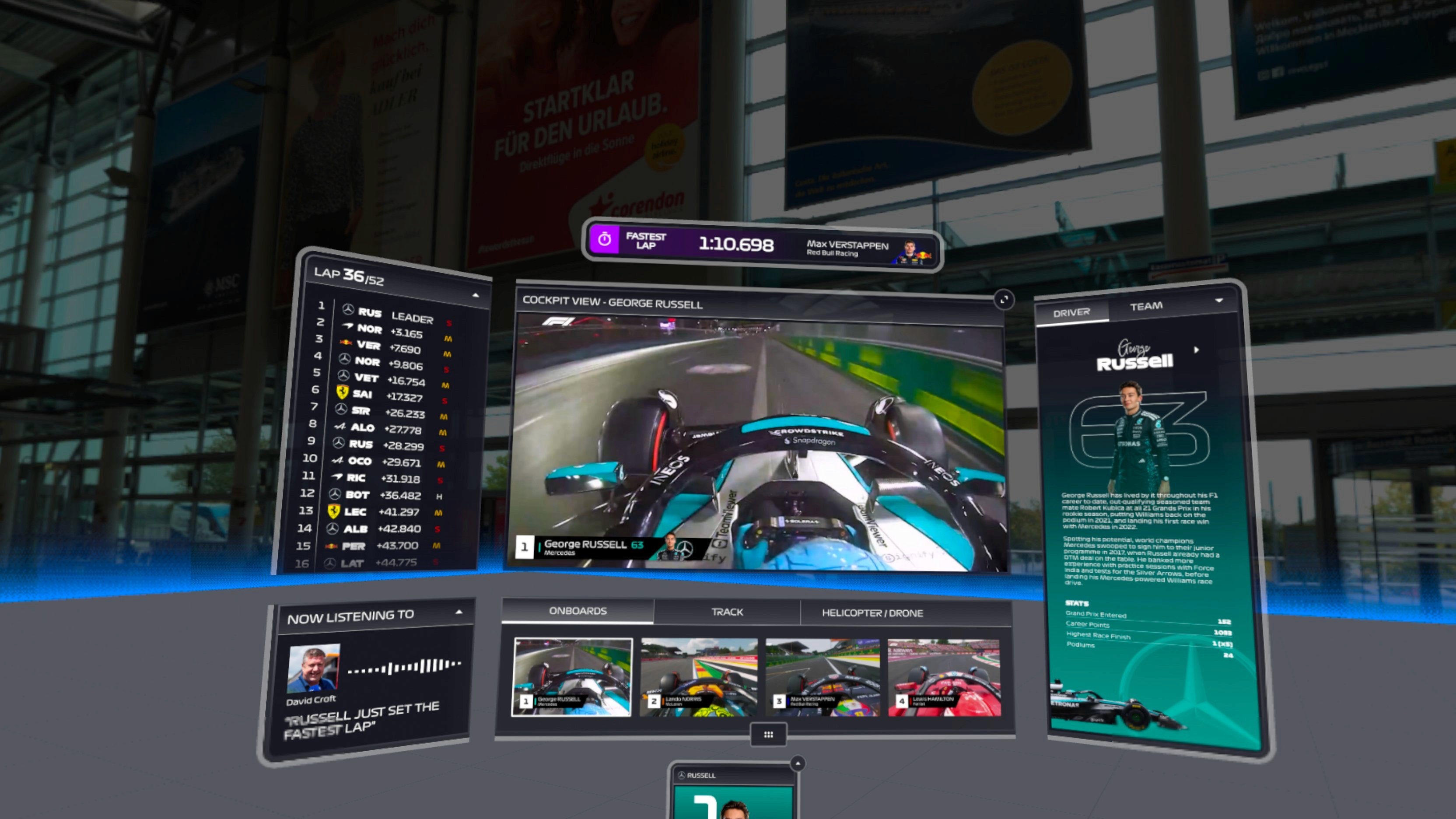Rather than a cinematic VR environment, the experience is structured as a spatial dashboard. The approach is closer to a racing simulation interface than a virtual grandstand.