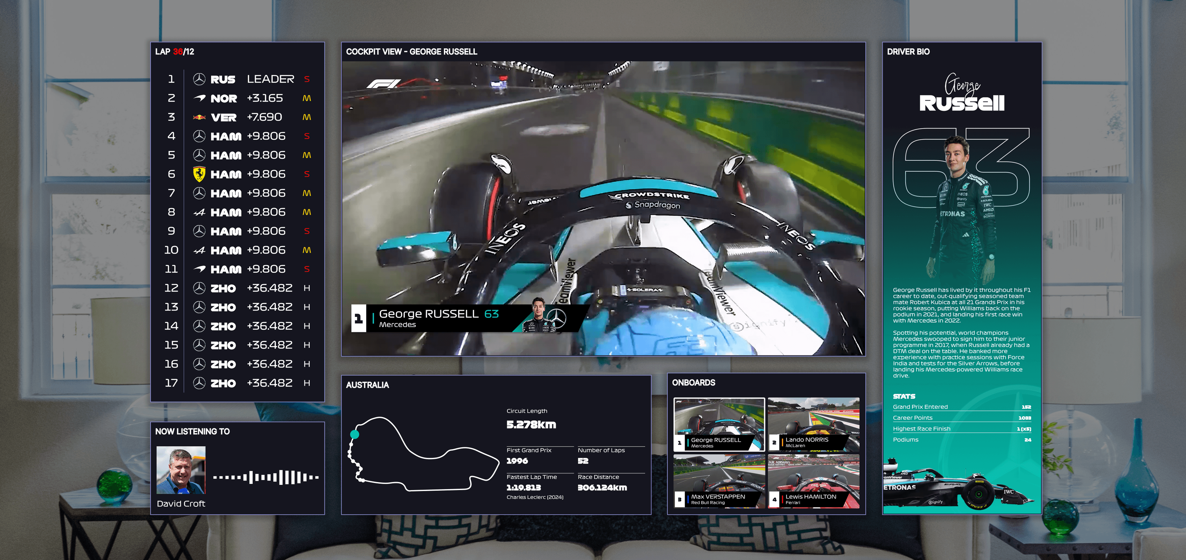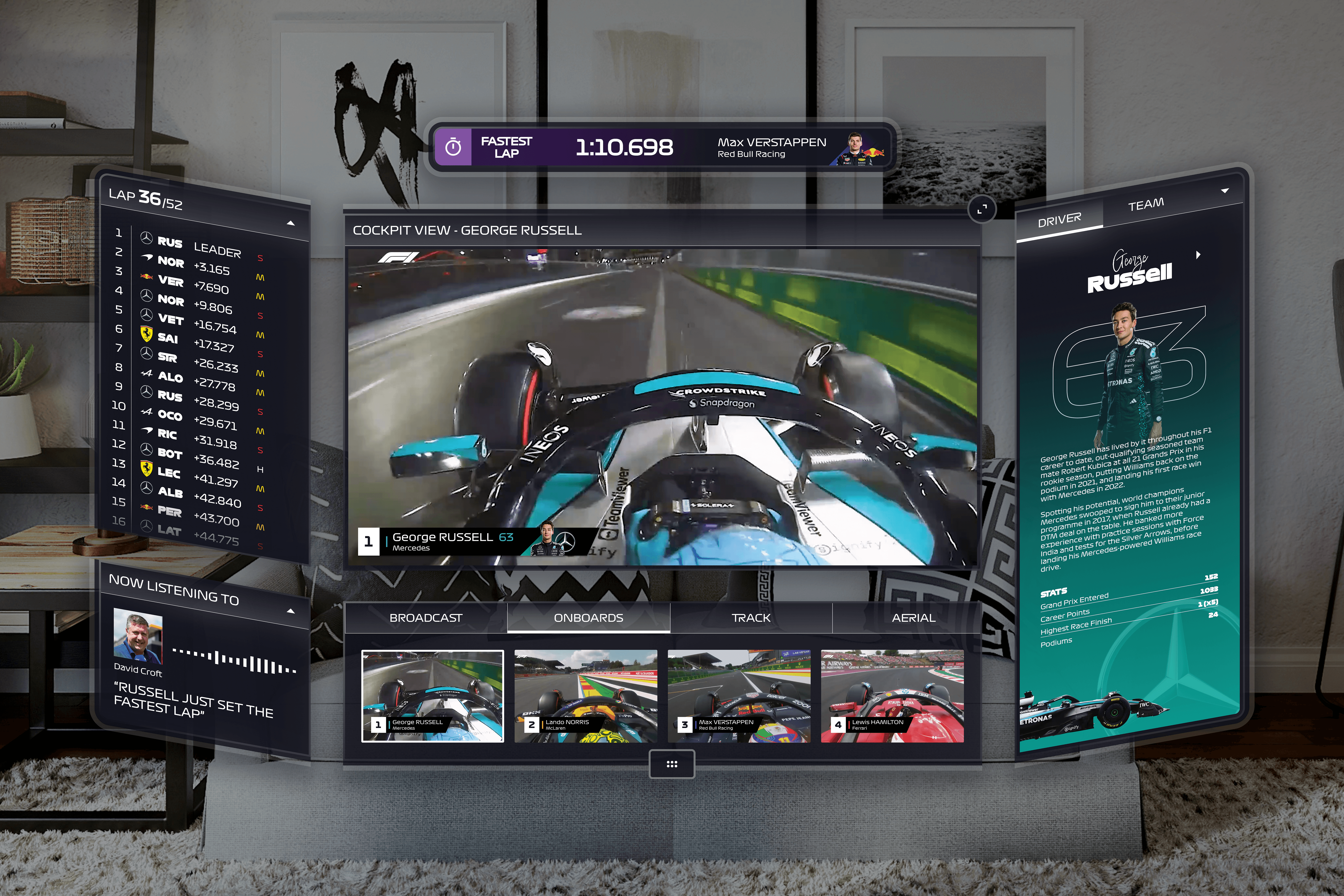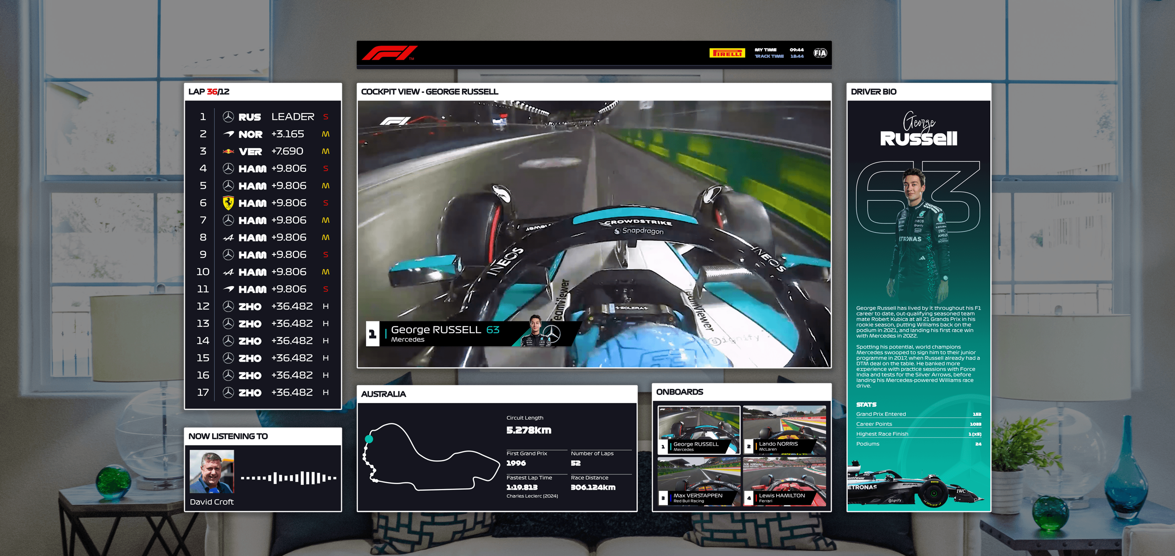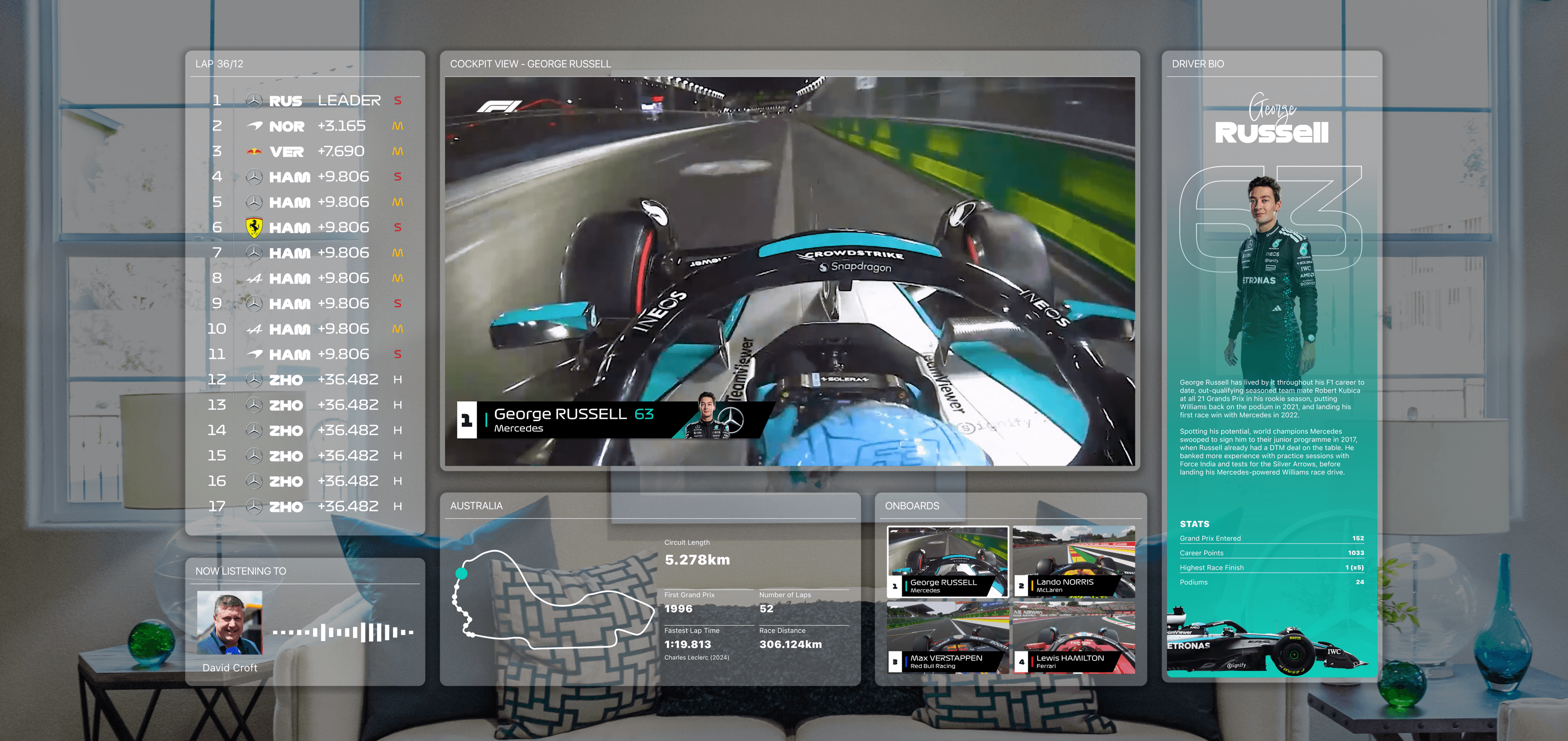 Formula 1 is one of the most data-rich spectator sports. Beyond the race feed itself, viewers continuously track driver positions, tire strategies, onboard cameras, radio communications, sector times, and changing race conditions. Traditional broadcasts compress this information into layered 2D graphics, forcing fans to parse complex data streams within limited screen space.