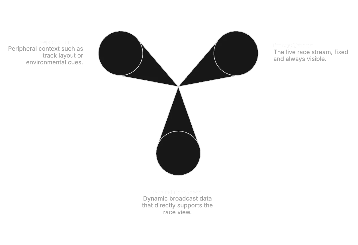 Instead of competing with the race feed, supporting information becomes ambient and accessible, allowing viewers to engage at their preferred level of detail.