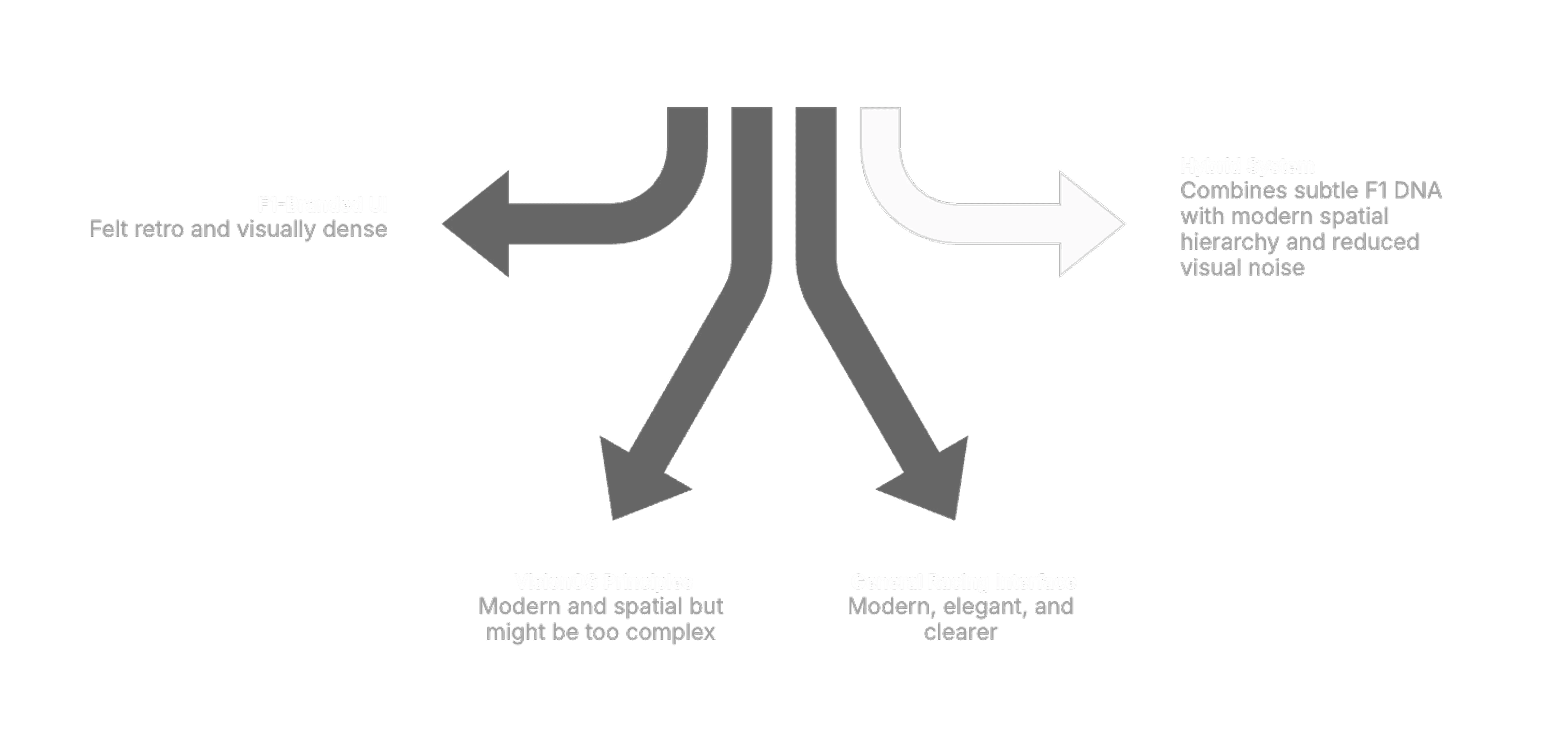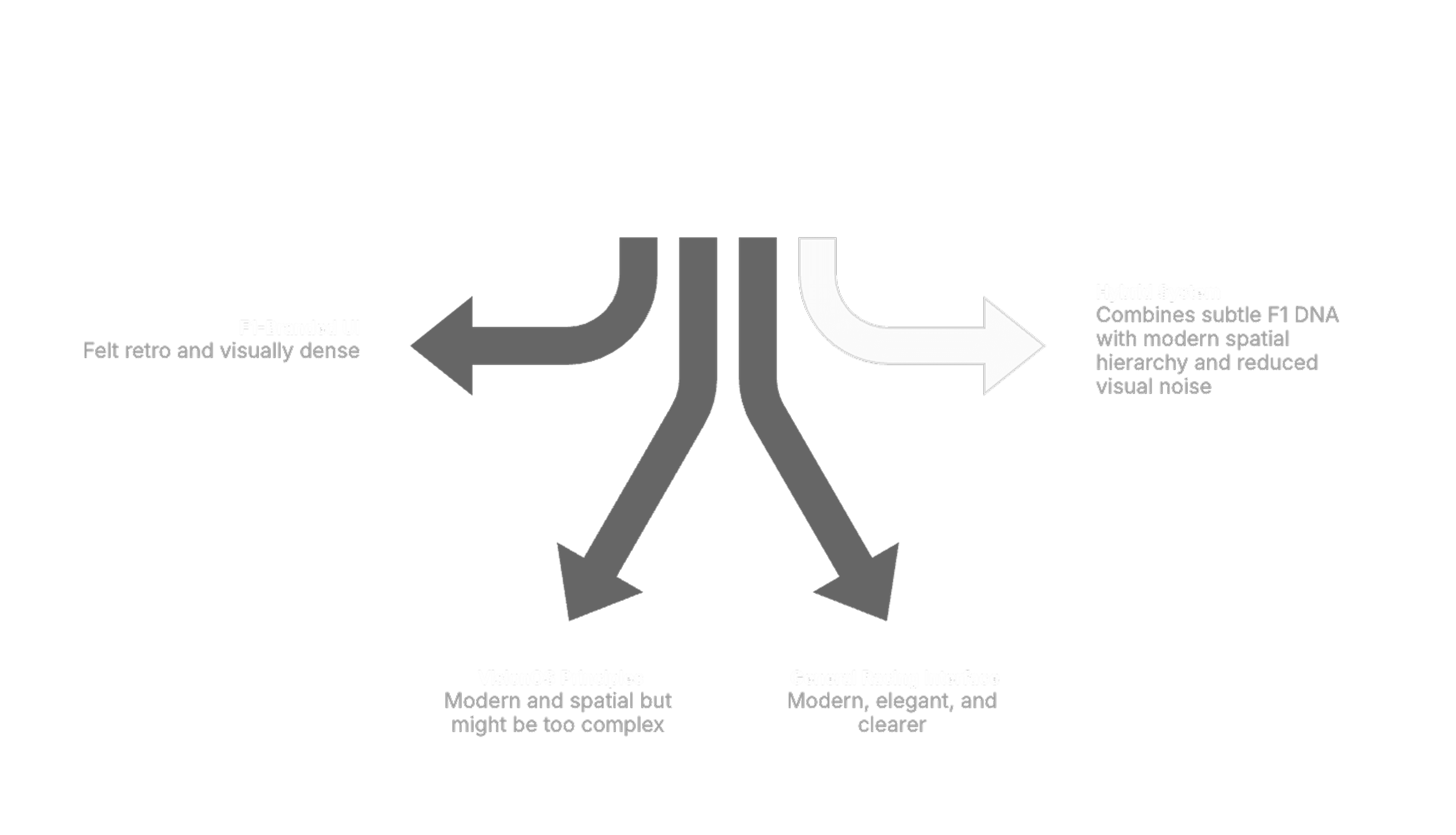 Early explorations ranged from interfaces closely aligned with Formula 1’s broadcast branding to more futuristic concepts. Feedback indicated that highly stylized approaches felt either dated or visually noisy in VR.